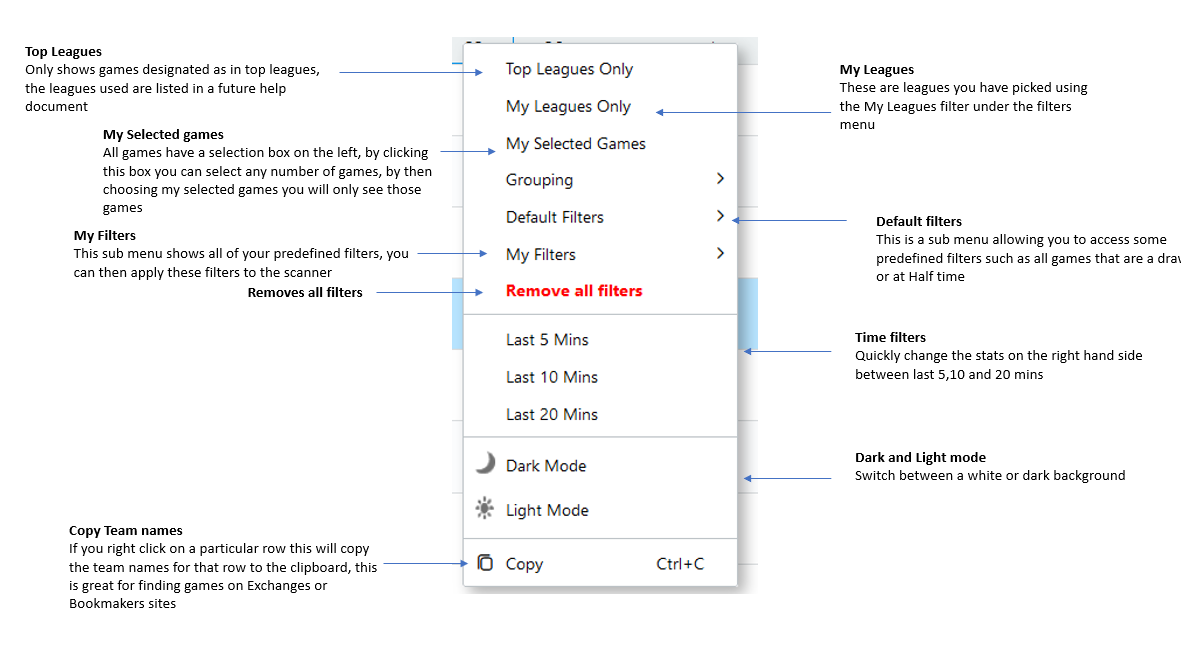 One of SoccerScanner’s standout features is the right-click menu (or long press on mobile/tablet). This tool allows you to quickly apply filters, toggle Dark Mode, or copy team names to your clipboard in seconds.